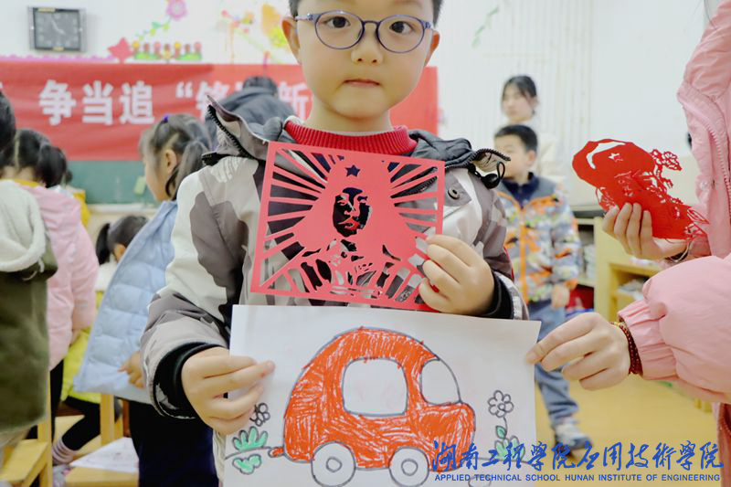 大家一起合唱《学习雷锋好榜样》。在学生党员们指导下,心灵手巧的小朋友们纷纷拿起剪刀剪出自己心中的雷锋叔叔模样。