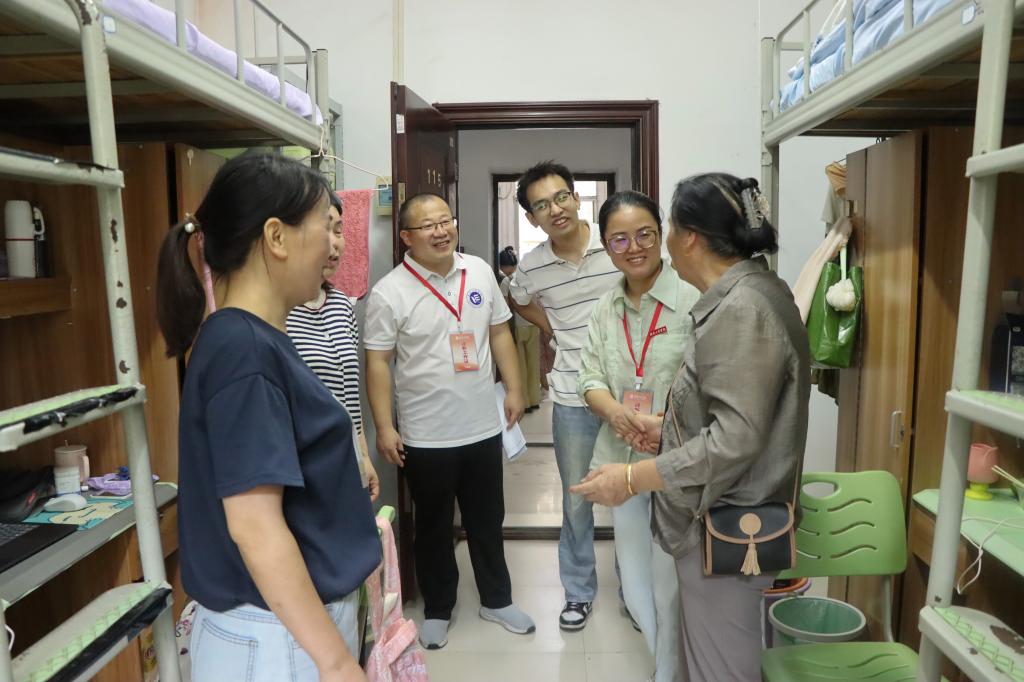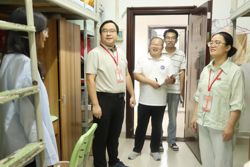 914日上午,张何、严明及全体辅导员、班主任深入宿舍,了解新生入住情况,帮助解决实际困难。走访中,院领导与新生亲切交谈,细致询问生活设施使用体验和初入大学的适应状态,并贴心分享集体生活技巧和作息建议。 特别强调宿舍安全,叮嘱上铺同学注意上下床安全,明确禁止使用大功率电器,帮助新生树立自我防范意识,共建安全、和谐的居住环境。