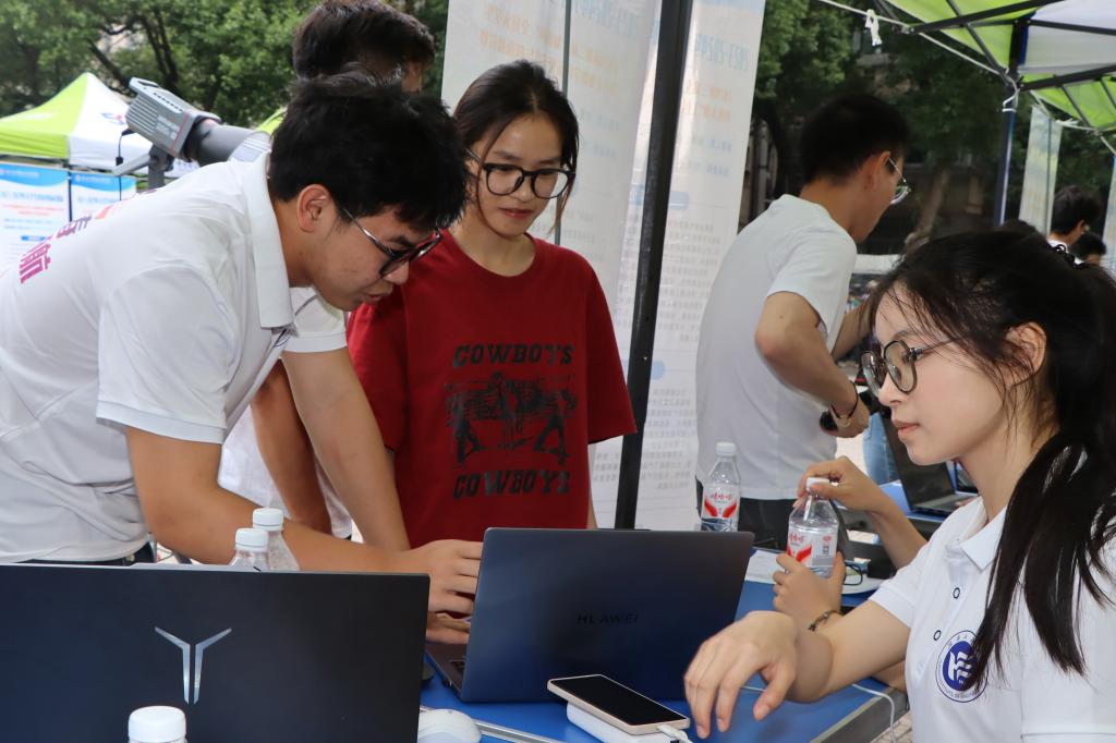 5月25日,书院路校区实验楼前,tyc7111cc太阳成“2023-2024大学生科技创新成果展”拉开了“智汇青春、创新领航”2025年大学生科技创新活动周帷幕。太阳成tyc7111cc集团党委委员、副校长魏克湘教授,校宣传部、学工部、团委和相关学院负责人出席开幕式。